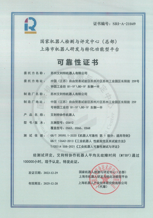 苏州艾利特机器人有限公司(以下简称艾利特)CS系列协作机器人顺利通过了上海机器人研发与转化功能型平台的 MTBF 100000小时测评。