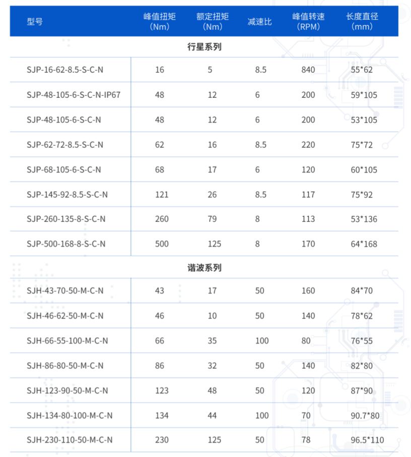 人形机器人一体化关节模组选型表