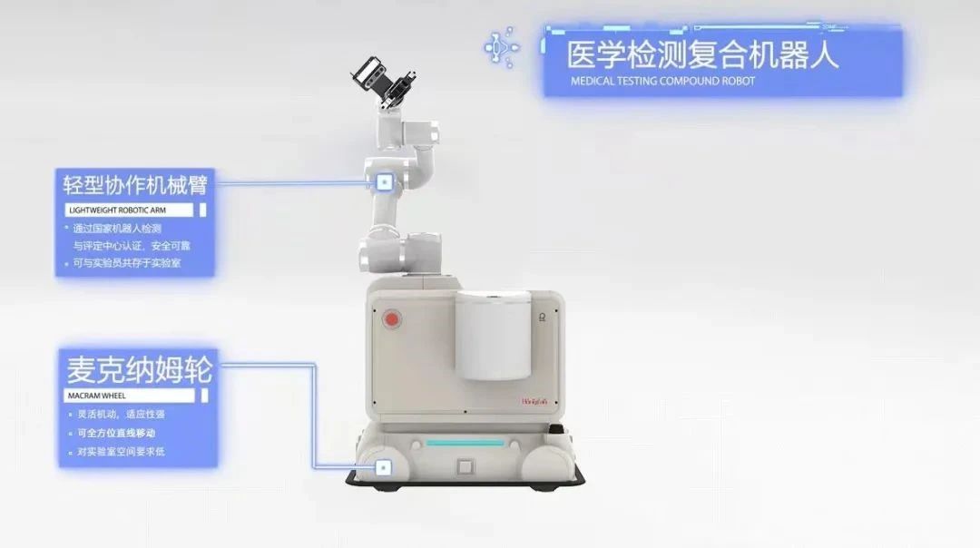 目前已为上海宏滩生物科技有限公司开发了一套全向移动复合机器人系统,采用移动AGV+机械臂的形式,在实验室内进行自动化的检测上下料等工艺流程,实现无值守医学检测实验室的自动化流程搭建。